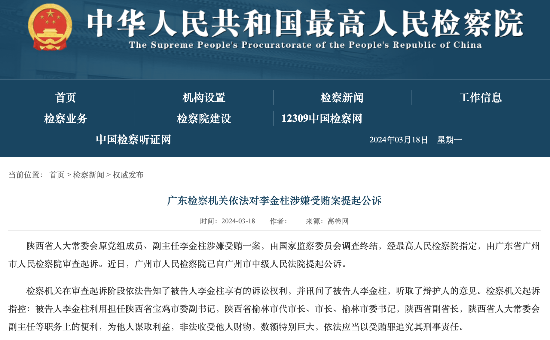 陕西省人大常委会原党组成员、副主任李金柱涉嫌受贿一案,由国家监察委员会调查终结,经最高人民检察院指定,由广东省广州市人民检察院审查起诉。近日,广州市人民检察院已向广州市中级人民法院提起公诉。