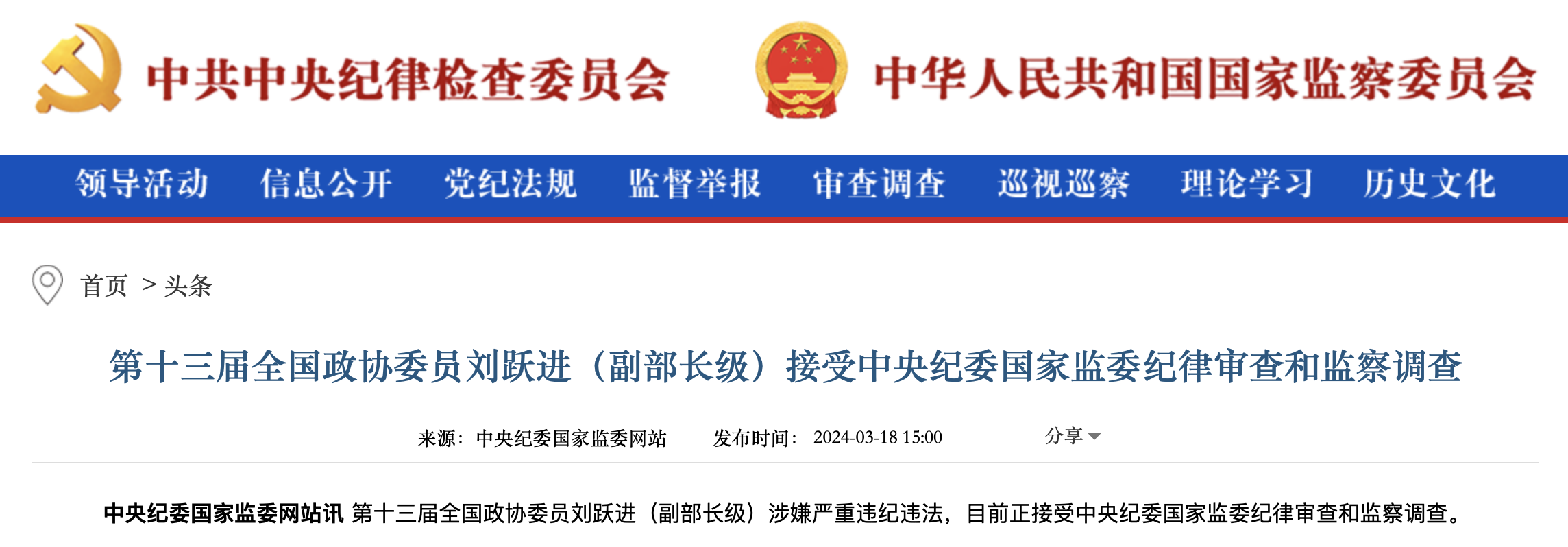 据中央纪委国家监委网站3月18日消息,第十三届全国政协委员刘跃进(副部长级)宣告落马,成为6天内第4名通报落马的中管干部。