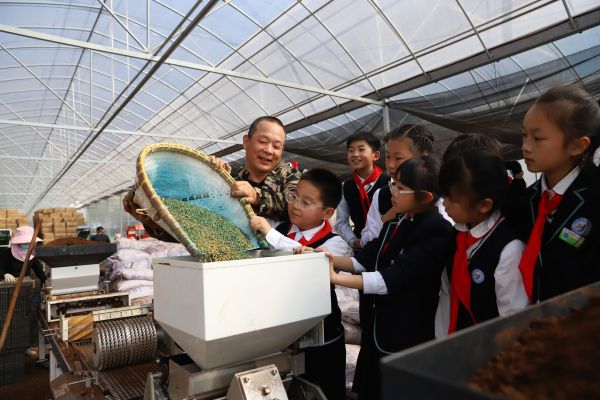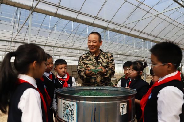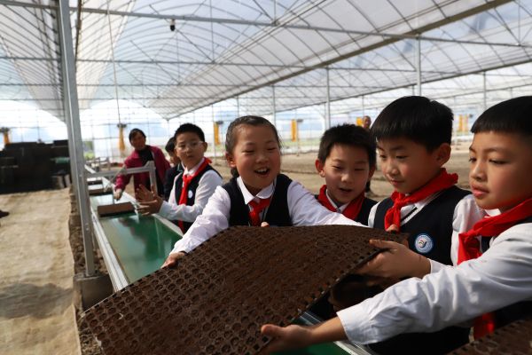 2024年3月19日,浙江省台州市,路桥区蓬街镇中心小学的学生在当地种粮大户工厂化育秧车间体验农事。蓬街镇中心小学在落实“双减”政策中,注重对学生综合素质的培养,结合生活实际开设一些“趣味课堂”,在春耕时节,学校开设“春耕课堂”,组织学生走进育秧车间和田间体验农事,让学生知农事、爱劳动、懂节约、会感恩。
