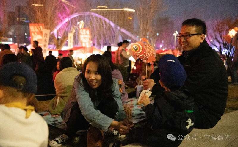 3月15日晚,北京亮马河燕莎码头,当晚的鱼灯巡游因为安全原因取消后,前来赏灯的一家三口在草坪上休息。