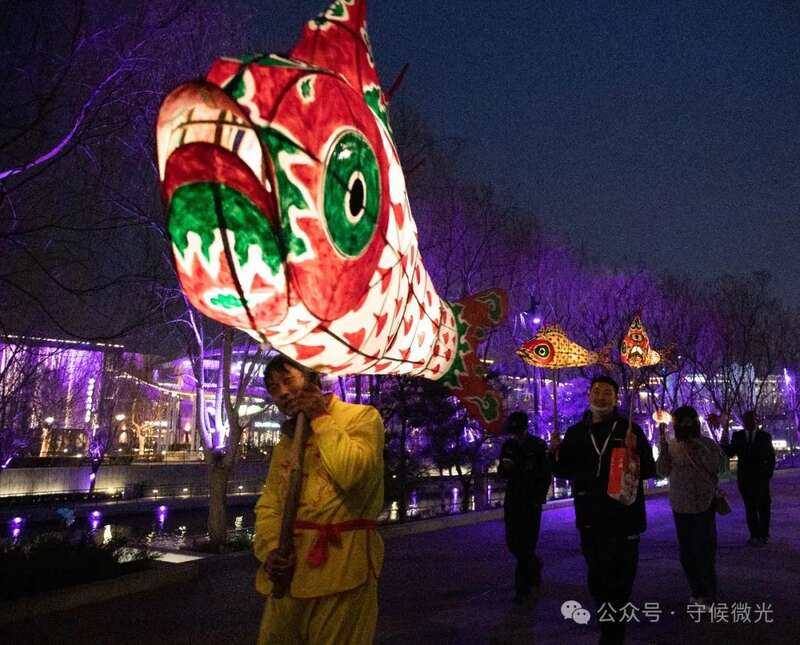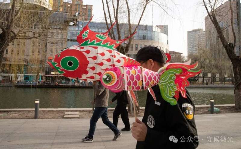 3月16日,北京亮马河边,汪金水扛着鱼灯巡游。他的儿子在清华大学读书,当晚,父子俩在巡游现场见了一面。
