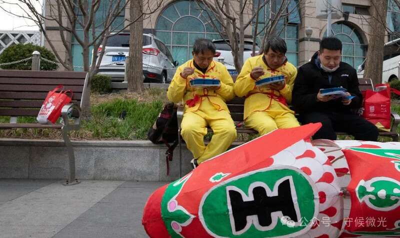 3月16日,北京亮马河边,汪芳设(左一)和汪金水(左二)正在吃晚餐。当天,鱼灯巡游从下午5点开始,半小时一轮。