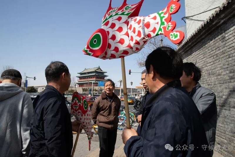 3月17日,北京前门,汪满田村的师傅们拿着两条小鱼灯准备回住地休息。这天,他们利用演出间隙抽空去天安门广场参观,因为安检要求,鱼灯不能带进广场,只能寄存在安检处附近。