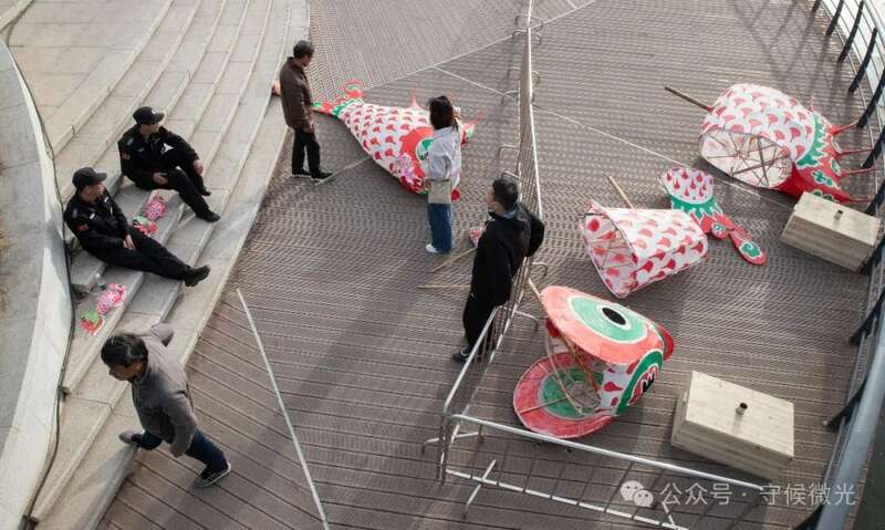3月16日,北京亮马河蓝梦桥下,汪芳设(左上)和汪金水(左下)扛着鱼灯到达指定点位,旁边5米长的大鱼灯尚未安装。王青华现场观测线路后,最终放弃5米鱼灯巡游,仅保留其在活动时作展示用,巡游时,使用3米长的鱼灯。