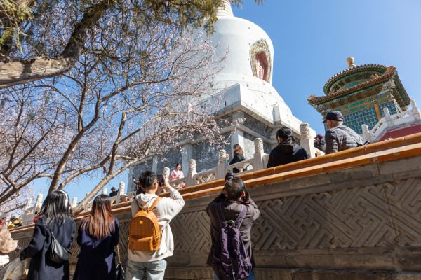 2024年3月20日,北京,北海公园白塔周边桃花绽放。市民拍照热情高涨。