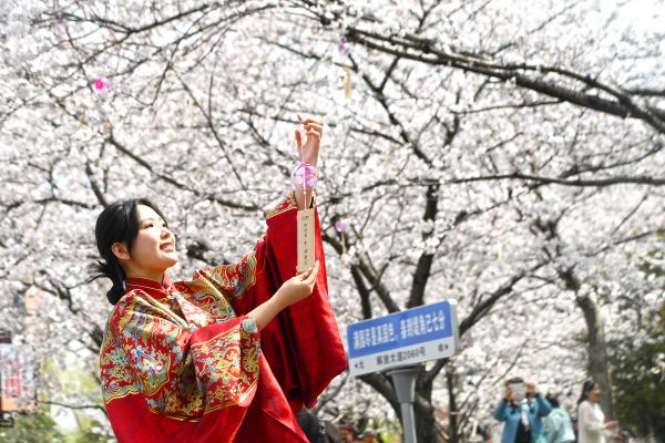 2024年3月19日,武汉,堤角公园樱花迎春绽放,市民游客入园打卡留影。