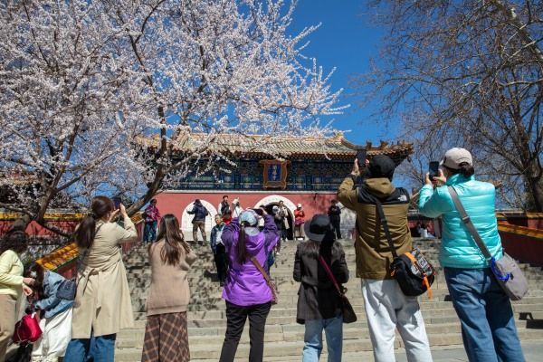 2024年3月20日,北京,北海公园阐福寺周边桃花绽放。市民拍照热情高涨。