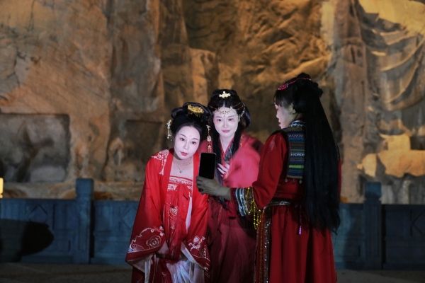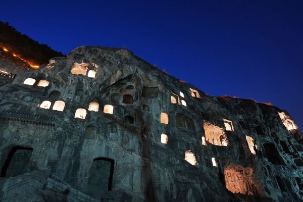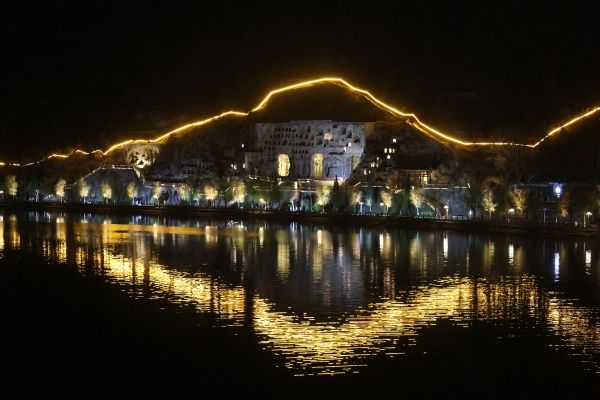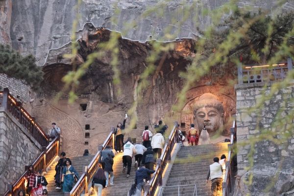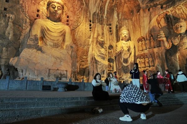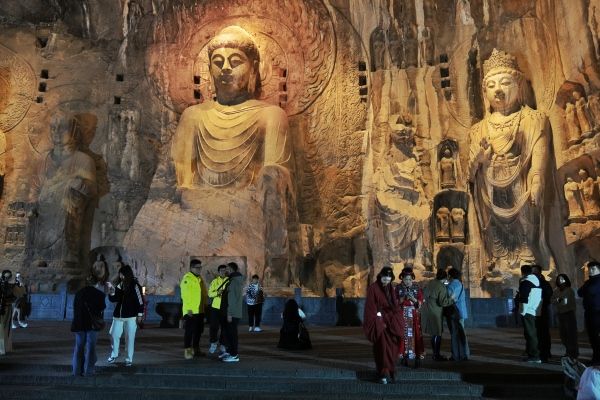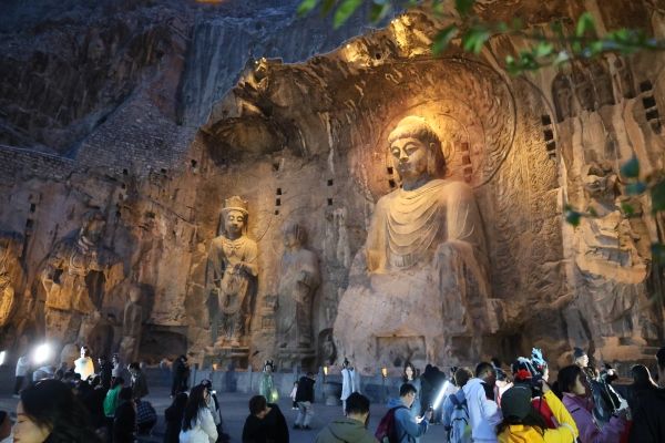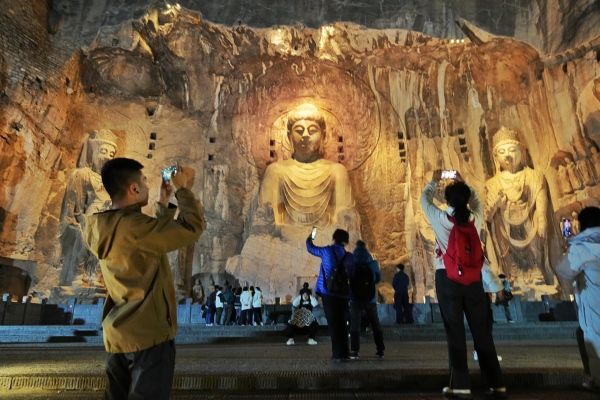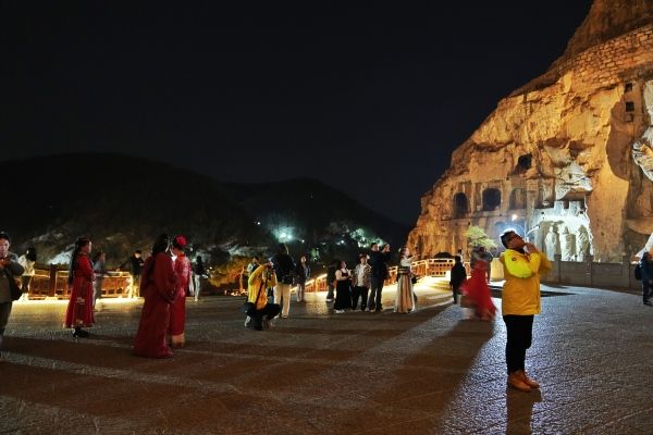 2024年3月20日,河南洛阳,游客在夜色中游览龙门石窟。据悉,为迎接第41届中国洛阳牡丹文化节,提升游客游览体验,当日起,河南洛阳龙门石窟景区开启夜景旅游项目。