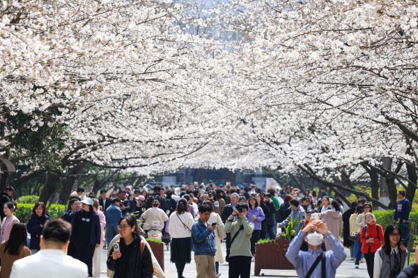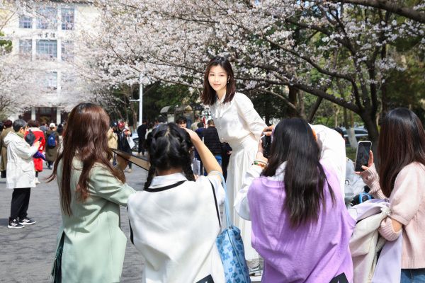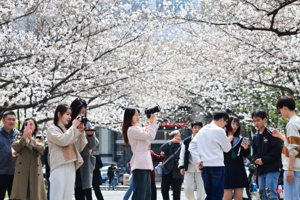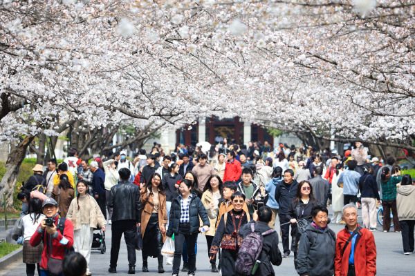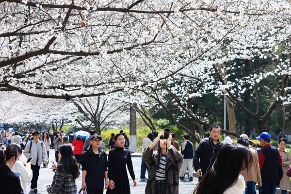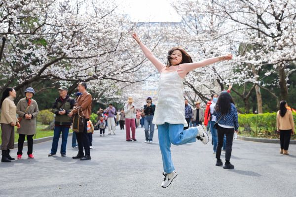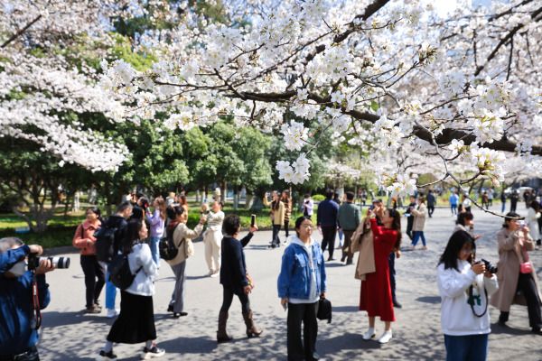 2024年3月21日,南京林业大学校园内樱花竞相绽放,吸引许多市民和师生前来赏花观景,享受美好春光。