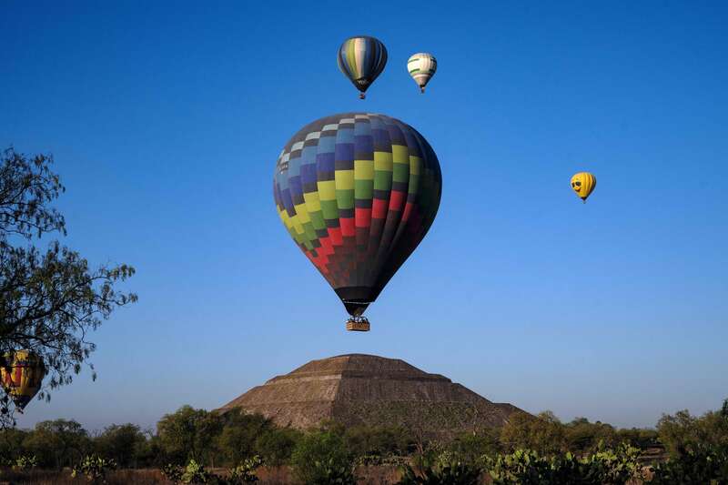 3月21日,墨西哥特奥蒂瓦坎,热气球从金字塔上空飞过。视觉中国供图