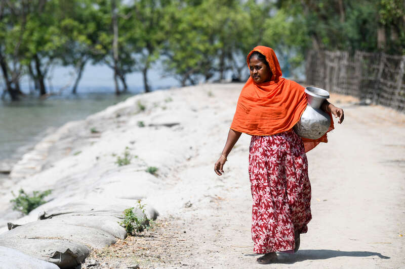 3月21日,孟加拉国达卡某地区,一名妇女从一家由当地非政府组织建立的反渗透工厂收集饮用水后返回。据介绍,当地居民正面临着因气候变化而加剧的饮用水危机,包括妇女和儿童在内的人们每天必须长途跋涉才能获得安全水源。视觉中国供图