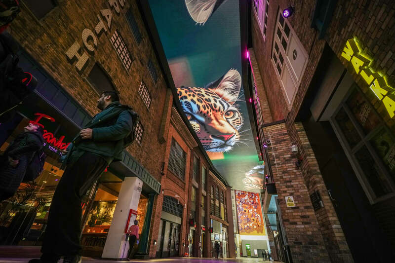 3月20日,英国曼彻斯特,动画出现在建筑天花板的新屏幕上。视觉中国供图