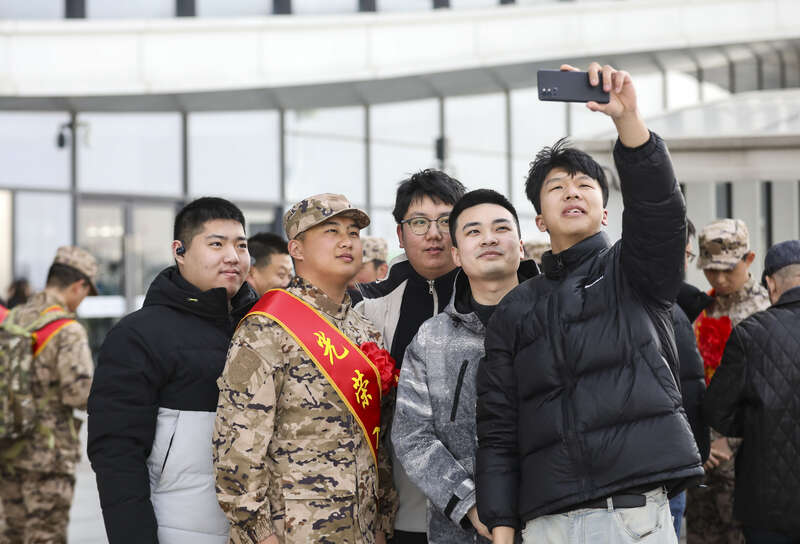 3月19日,江苏省淮安市,即将奔赴军营的新兵与同学一起合影。近日,当地春季新兵告别亲人和家乡,启程奔赴新疆、广西、河北、四川等地军营,开启军旅生涯,踏上从军报国的征程。视觉中国供图