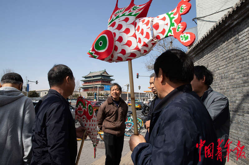 3月17日,北京前门,汪满田村的师傅们拿着两条小鱼灯准备回住地休息。3月15日-17日,他们受邀来到北京参加某国潮文化节活动,期间,他们表演的鱼灯巡游受到了北京市民的热烈关注。鱼灯巡游是安徽省黄山市歙县汪满田村的一项省级非物质文化遗产民俗活动,通过社交媒体的推广,村民们陆续接到商业演出的订单,去外地的大城市演出,传统民俗焕发出新的生机。陈鹏多/摄