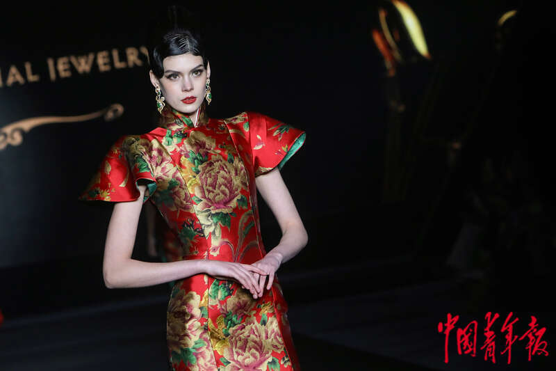 3月19日,北京正大中心,一场新中式定制旗袍发布会上,一名外籍模特身着旗袍走台展示。3月18日至22日,AW2024北京时装周在这里举行,作为2024年北京消费季重点活动之一,本次时装周涵盖潮流发布、商贸展会、数字时尚等一系列丰富多彩的活动。中青报·中青网记者 孔斯琪/摄