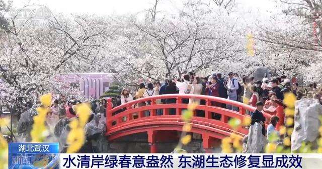 三月的东湖,樱花、桃花、海棠花竞相盛放,游人在景中穿行,构成一派如诗如画的和谐景象。