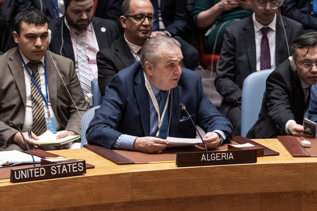 当地时间2024年3月22日,美国纽约,联合国安理会就美国提出的关于巴以问题的决议草案被否决后,阿尔及利亚常驻联合国代表阿马尔·本达马(Amar Bendjama)发表讲话。
