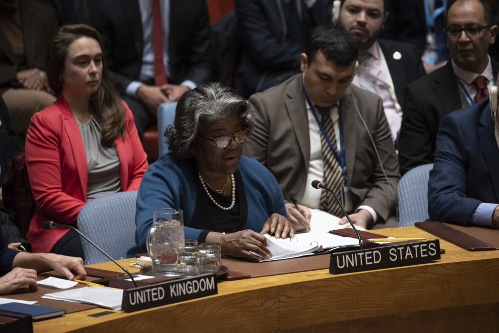 当地时间2024年3月22日,美国纽约,美国常驻联合国代表琳达·托马斯-格林菲尔德出席当日的安理会会议。