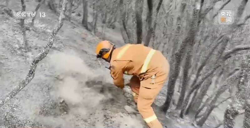 起初火情区也有高空浇水辅助,但随着烟雾愈发浓烈,无人机和直升机已经不具备起飞的条件,地面灭火成为唯一途径。由于凌晨时段,山中几乎无风、温度低、湿气重,最适合扑灭,所以接下来的每天,刘磊一行人只能休息四五个小时,每到天不亮就继续灭火,为了效率,他们的吃住行也只能在山中解决。而这期间,他们既要兼顾速度,又要避免二次燃烧,随着明火点减少,消防工作渐渐转入清理烟点和站杆倒木的阶段。