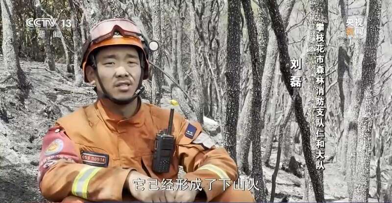 攀枝花市森林消防支队仁和大队 刘磊:山里面着火的植被主要是以云南松为主,它主要的特点就是易燃,且它有落叶,落叶就造成它的林下可燃物多。我们来扑打的时候它已经形成了下山火,就是很容易进行扑打。但是像极个别的地方,在我身后大概有1公里左右的位置,是不怎么好扑打的。