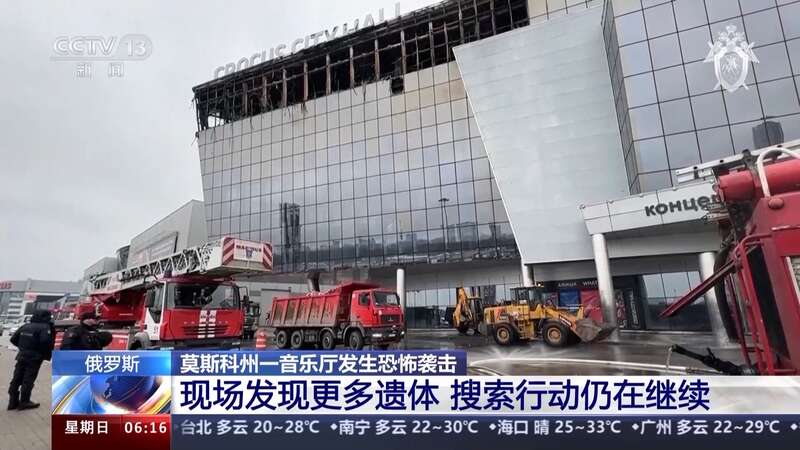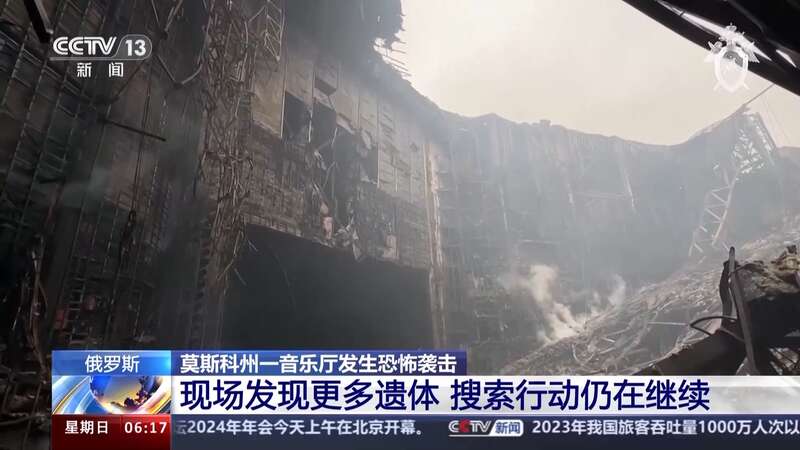 俄罗斯紧急情况部23日发布消息称,遭恐袭的音乐厅内明火已全部扑灭。莫斯科州州长沃罗比约夫当天表示,音乐厅恐袭现场的救援行动已经结束,搜索行动仍在进行中。