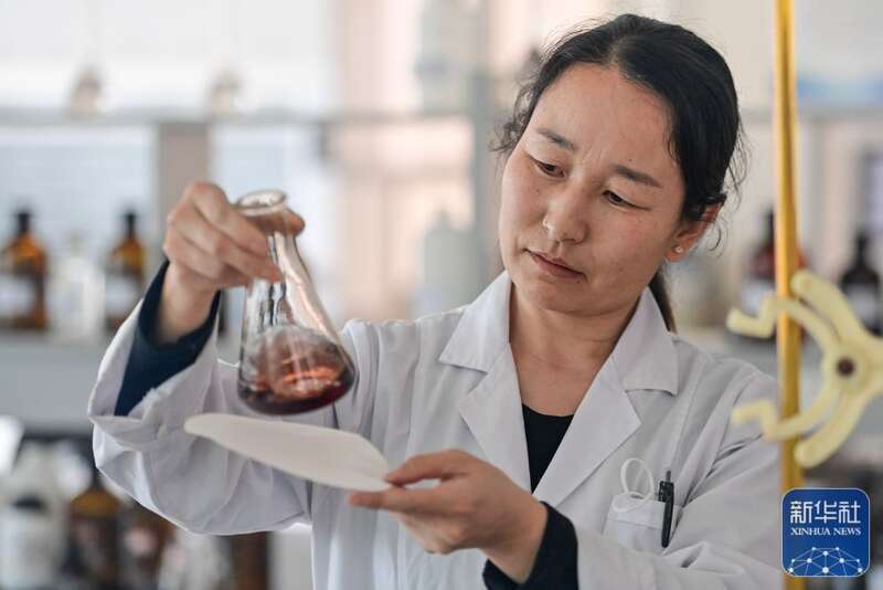 在新疆阿克苏嘉邦肥业有限公司,工作人员进行有机肥养分测定实验(3月23日摄)。