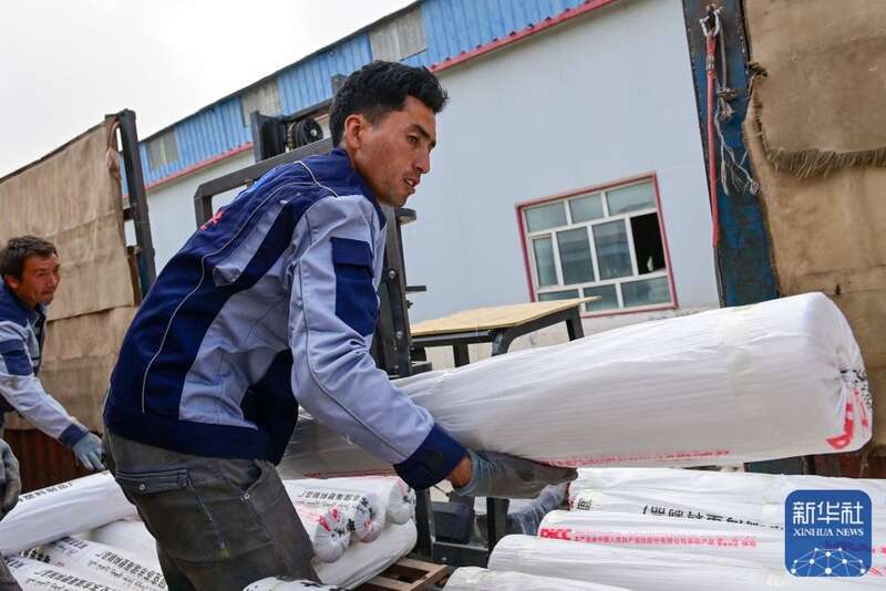 在新疆阿克苏市瑞海农业发展有限责任公司,装卸工将生产的地膜装车(3月23日摄)。