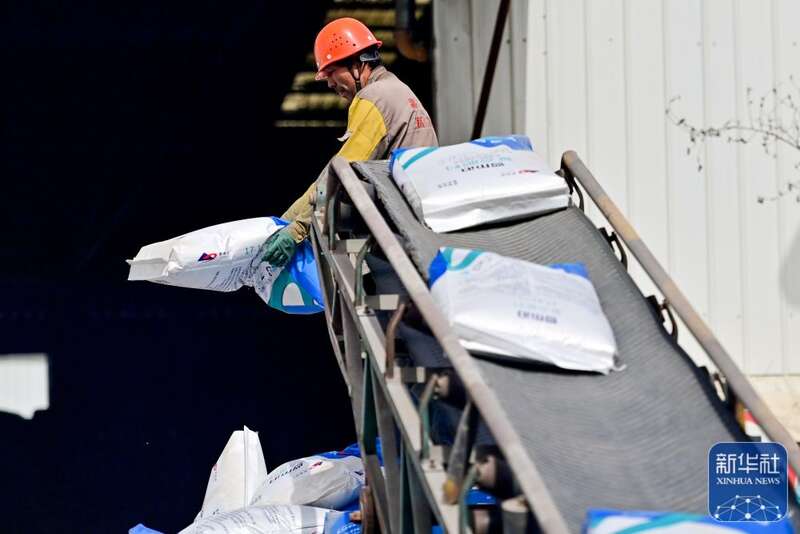 在新疆阿克苏嘉邦肥业有限公司,装卸工运送生产的化肥(3月23日摄)。