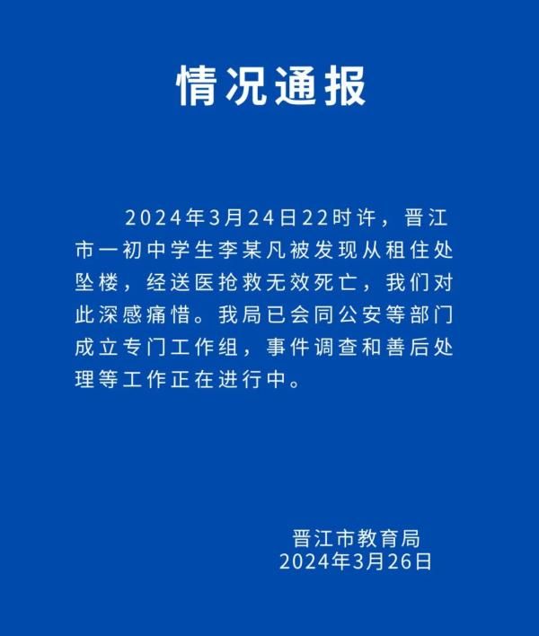 据福建晋江教育局3月26日通报,2024年3月24日22时许,晋江市一初中学生李某凡被发现从租住处坠楼,经送医抢救无效死亡,对此深感痛惜。该局已会同公安等部门成立专门工作组,事件调查和善后处理等工作正在进行中。