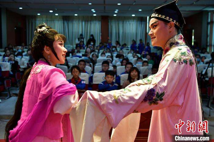 2023年3月15日,以“独具匠心 多彩‘遗’迹”为主题的非遗文化进校园活动在福建省福州市仓山区第六中心小学举行,闽剧演员为同学们表演闽剧。 记者 张斌 摄
