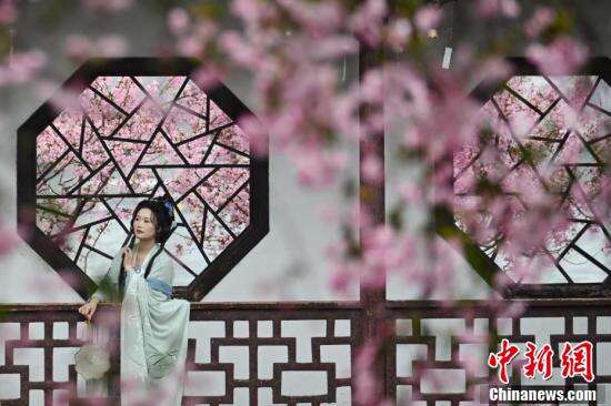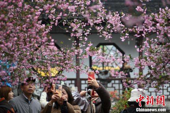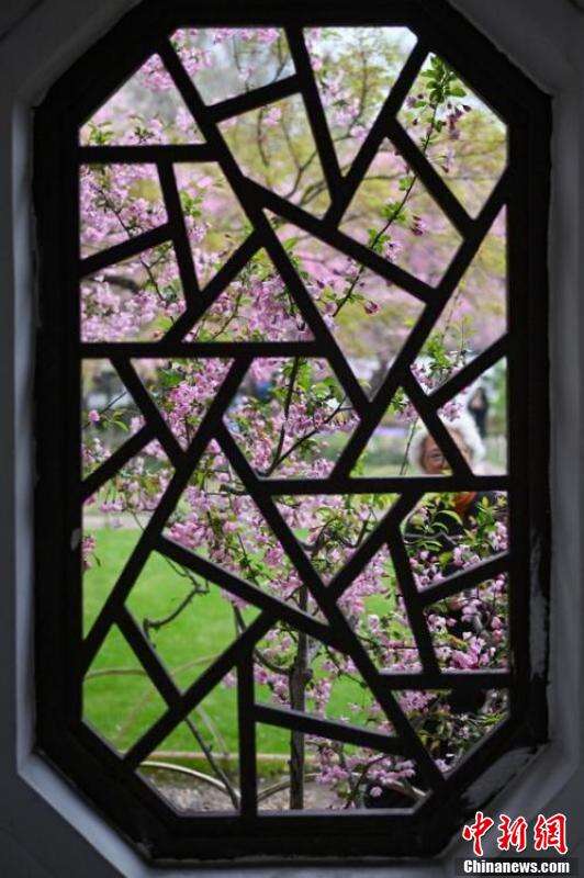 3月27日,江苏南京,莫愁湖公园里的海棠花迎来盛放期,团团簇簇的粉嫩花朵垂在枝头,与江南园林建筑相映成趣,吸引市民和游客前来赏花拍照,享受春日美景。