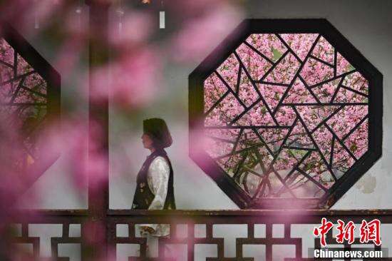 南京莫愁湖公园内莫愁女雕像旁的海棠花盛开,呈现“画意江南”。
