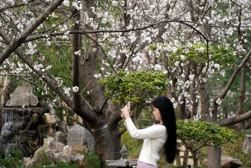游客在位于河南省鄢陵县的一处园林内拍照(3月26日摄)。新华社记者 李安 摄