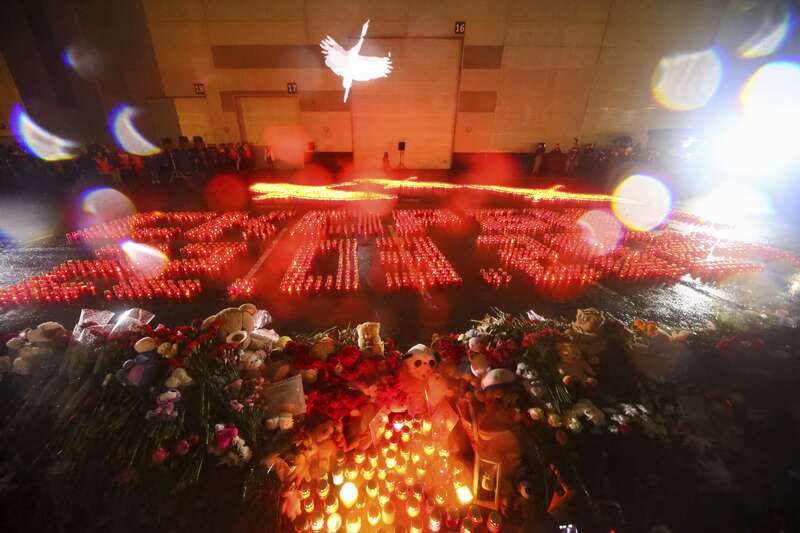 3月25日,俄罗斯莫斯科,在“番红花市政厅”音乐厅前的临时纪念碑旁,点燃的蜡烛上写着:“我们哀悼2024年3月22日”。当地时间3月22日晚,在俄罗斯莫斯科州“番红花市政厅”音乐厅发生恐怖袭击,造成重大人员伤亡。截至3月29日,这次恐怖袭击事件的死亡人数升至144人。 视觉中国供图