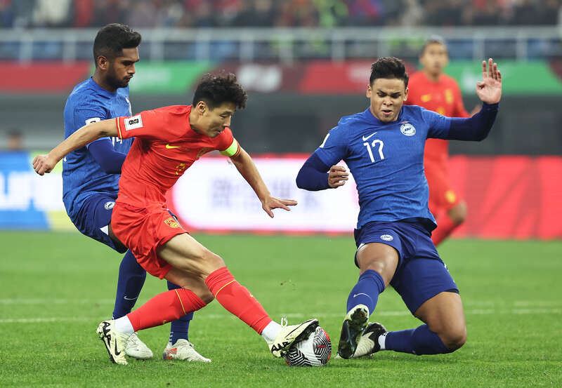 3月26日,天津奥林匹克体育中心,2026年美加墨世界杯亚洲区预选赛36强赛C组第4轮,中国男足主场对阵新加坡队,中国队7号武磊(左二)在对方夹防中起脚射门。中国队凭借武磊的两射一传、费南多的点球得分和下半场替补上场的韦世豪的破门,以4:1战胜新加坡队。刘占崑/摄