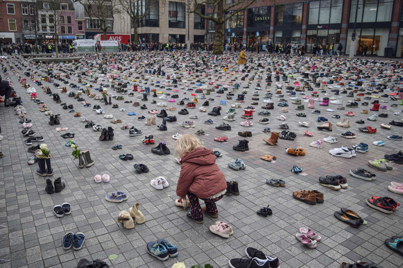 3月17日,荷兰乌得勒支,14000只童鞋展出,以纪念在巴以冲突中丧生的巴勒斯坦儿童。视觉中国供图