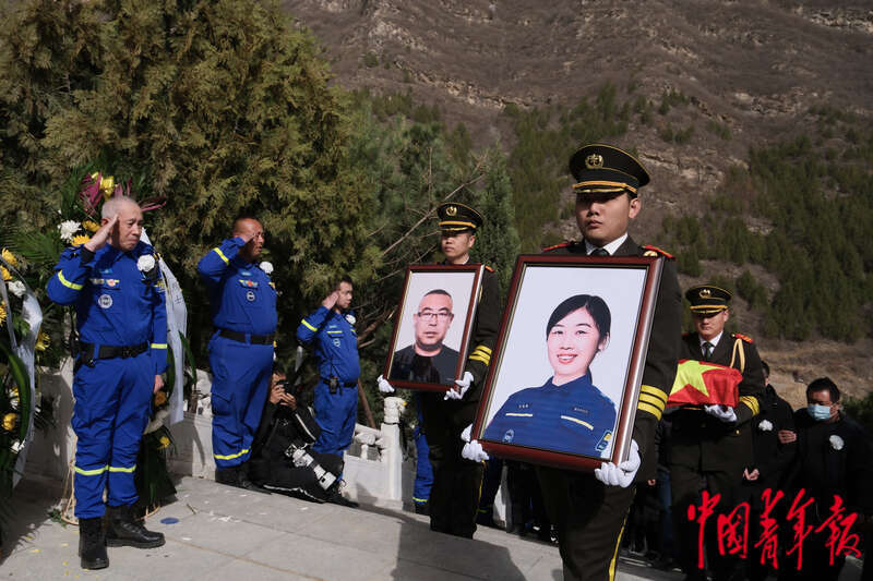 3月28日上午,北京市房山区平西烈士陵园,蓝天救援队队员王宏春、刘建民烈士安葬仪式现场,烈士亲属、蓝天救援队代表和社会各界人士前来送别。2023年7月29日至8月2日,北京市遭遇特大暴雨灾害,两位烈士在抢险救灾过程中献出了宝贵的生命。田嘉硕/摄