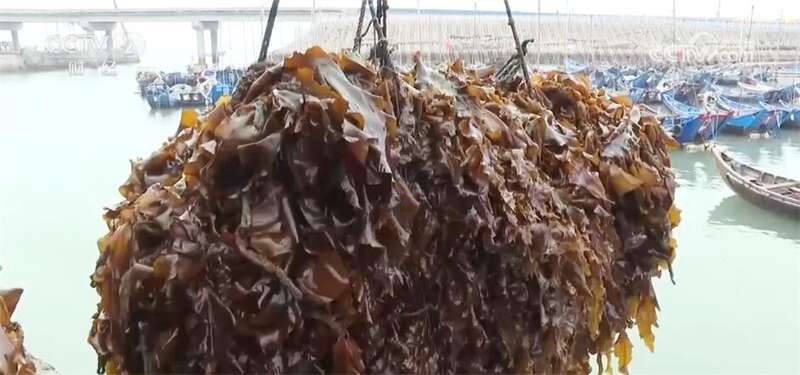 在连江县黄岐湾海域看到,一些海带养殖户正驾着渔船,穿梭在一排排由浮球、养殖绳构成的海上“田垄”中,将一棵棵2米多长的海带吊到船上,码放整齐,运送上岸。