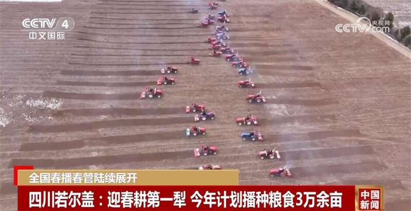 在四川若尔盖,传统农耕项目“二牛抬杠”迎来春耕第一犁,骑手们开着旋耕机在田地间轮回翻耕。农业生产与乡风文明有机结合,开启了今年计划播种粮食3万余亩的工作。