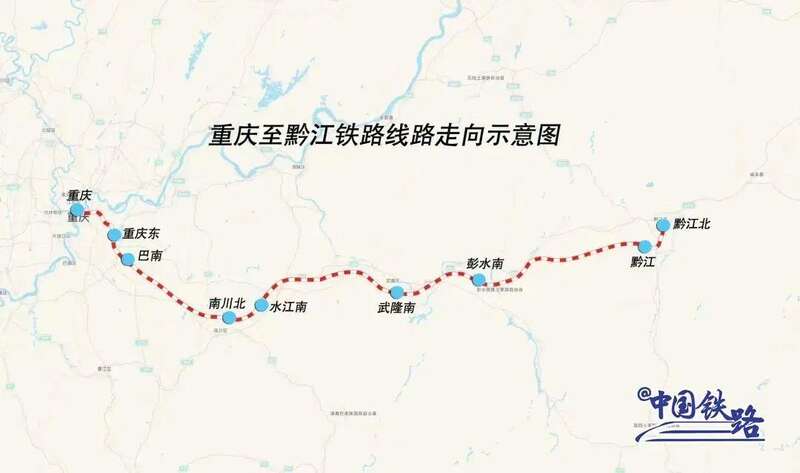 重黔铁路从重庆站引出,途经重庆市渝中、南岸、巴南、南川、武隆、彭水等区县,到重庆市黔江区,正线全长约269公里,设计时速350公里。