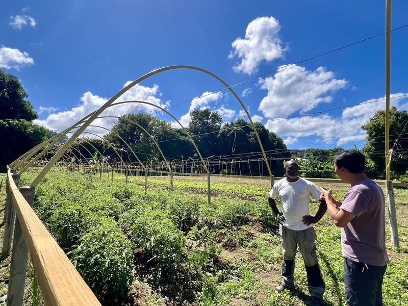 孙浩杰:“这大棚建起来非常不容易。2017年飓风玛利亚那是非常可怕的,竹子大棚全部毁完了。但他非常有韧性,还是朝着原来的方向,重新选址规划农场。这次他找银行融资贷款,直接就用钢结构的大棚,我们也给他提供一些指导,适合大棚栽培的像甜椒、豇豆、黄瓜、西红柿,包括火龙果等室外的果蔬栽培,发展得很稳健。”