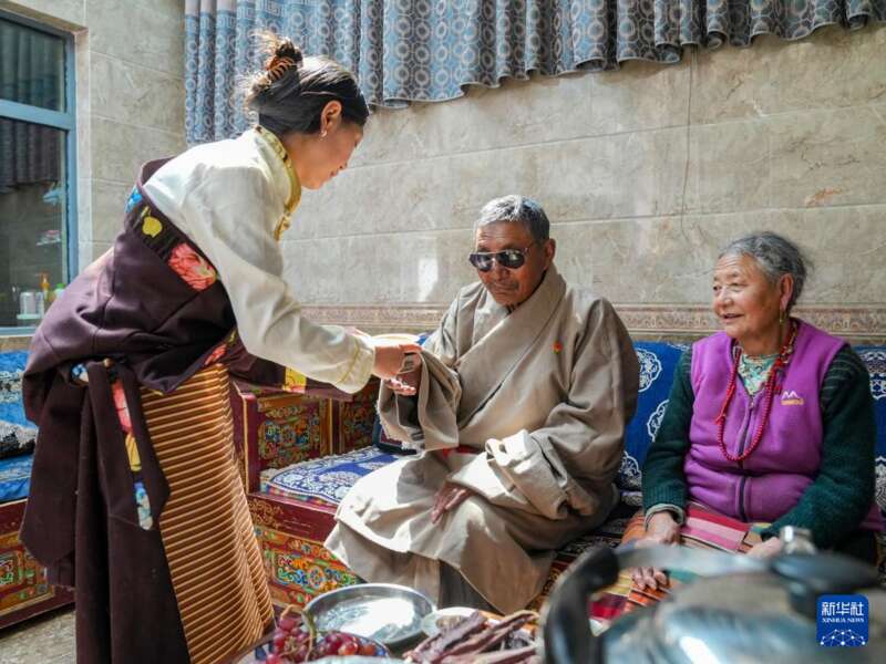 白玛的孙女嘎桑玉珍(左)为他和老伴多吉卓玛敬酥油茶(3月27日摄)。新华社记者 丁汀 摄