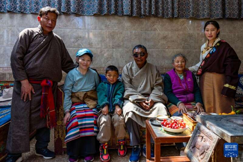 白玛老人(左四)在家中与家人合影(3月27日摄)。新华社记者 姜帆 摄