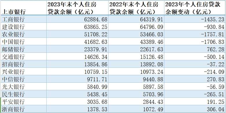 最新披露的大中型银行2023年年报显示,作为按揭贷款发放主力军的国有六大行,有5家个人住房贷款余额出现减少,7家全国性股份制银行(招行、兴业、中信、民生、光大、平安、浙商)中,4家减少,3家增长。