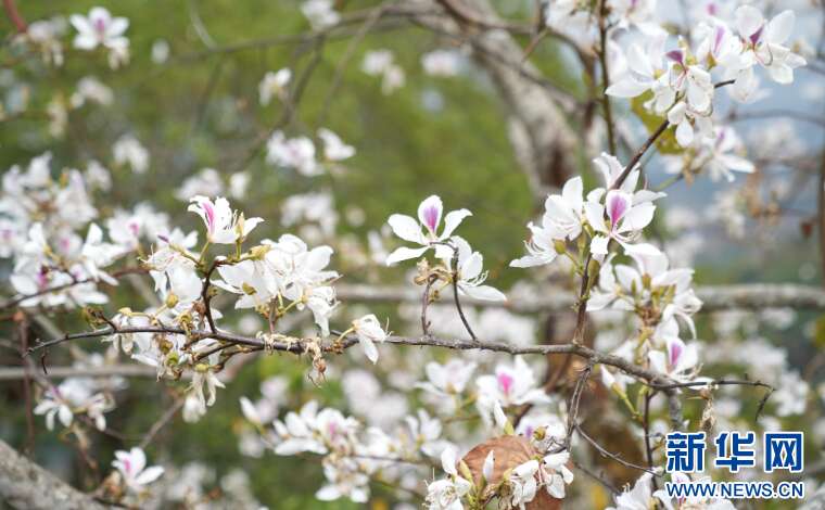 白花盛开点缀乡间风景(4月1日摄)。新华网发(三台山德昂族乡人民政府 供图)
