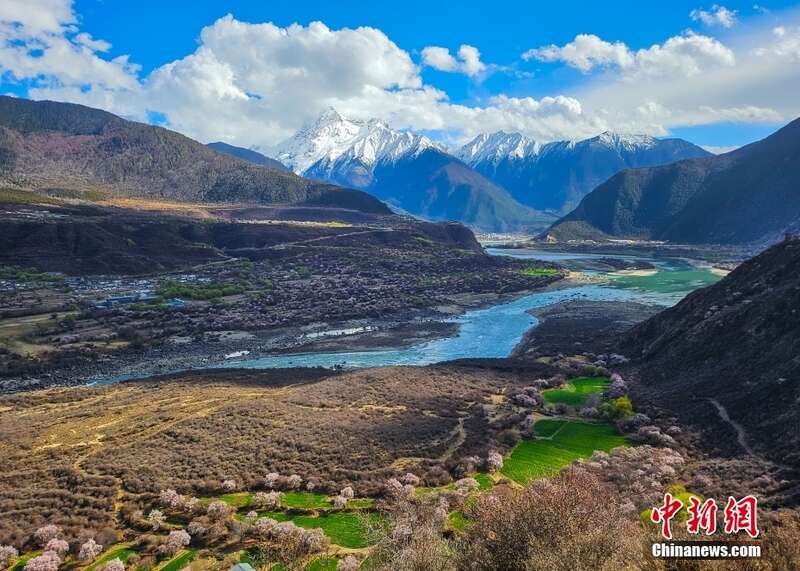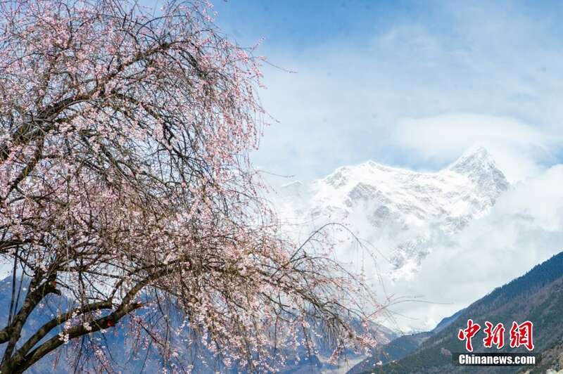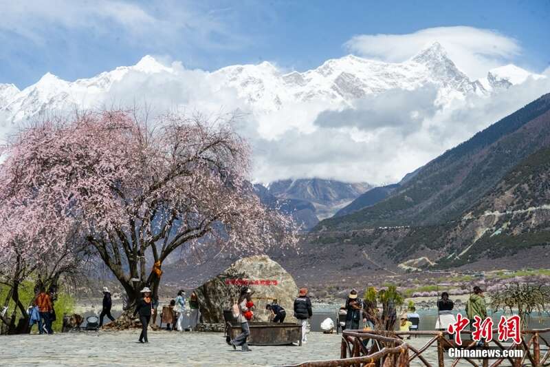4月1日,西藏林芝市米林市境内的南迦巴瓦峰下,桃花盛开,吸引了众多游客前来游玩。南迦巴瓦峰被誉为“众山之父”,海拔7782米,其山顶终年积雪,而山脚下则是郁郁葱葱的树木和盛开的桃花,形成了一幅独特的垂直自然景观。图为南迦巴瓦峰脚下的桃花林。