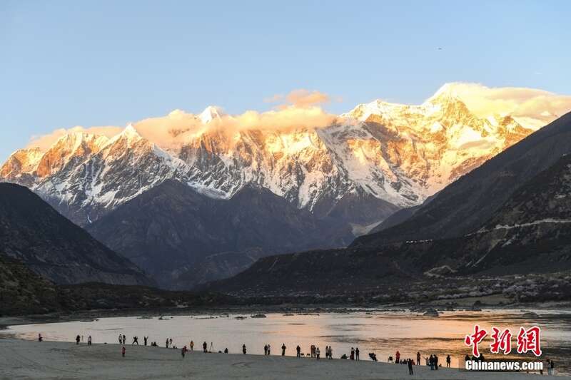 图为游客在南迦巴瓦峰脚下观赏“日照金山”。