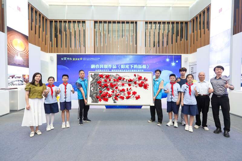 展览中,一幅共创作品《阳光下的木棉花》受到广泛关注。作品长2米、高1米,以岭南特有的红木棉树为主题,在黝黑挺拔的树干的映衬下,数十朵手工制作的木棉愈发火红热烈、呼之欲出。这幅画作历时两周完成,从造纸到绘画,再到手工制作“扭扭花”木棉,均由广州市小北路小学学生和“星孩”学员们合作而成。