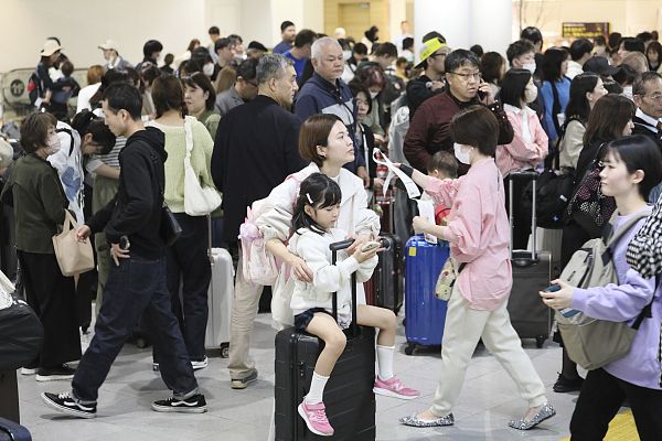 当地时间2024年4月3日,日本福岛县福岛市发布海啸警报后,福冈机场挤满了旅客。