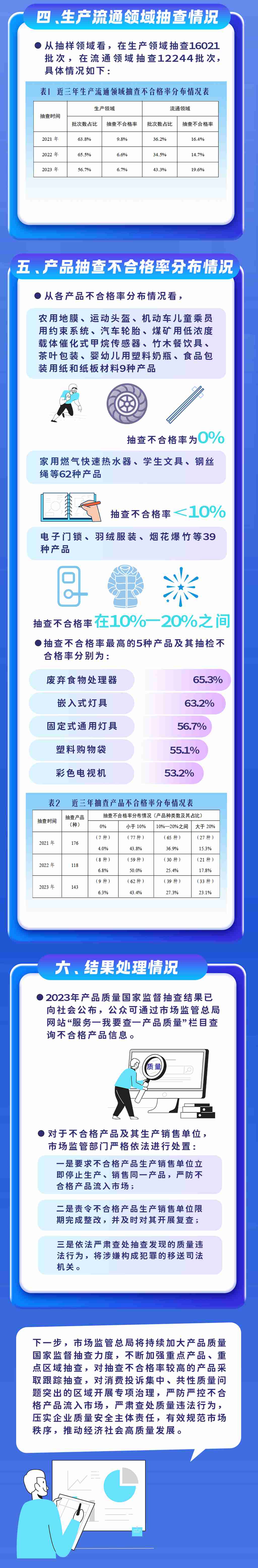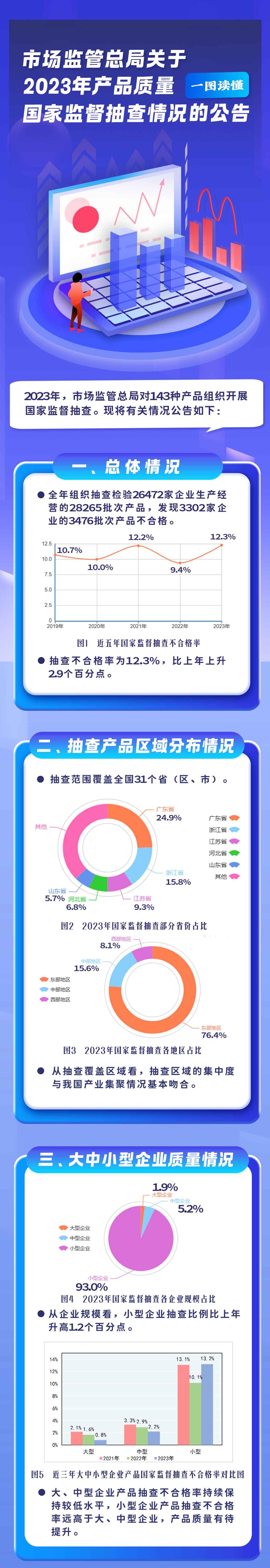 记者今天了解到,市场监管总局通报了2023年产品质量国家监督抽查情况。2023年,市场监管总局对143种产品组织开展国家监督抽查。全年组织抽查检验26472家企业生产经营的28265批次产品,发现3302家企业的3476批次产品不合格,抽查不合格率为12.3%,比上年上升2.9个百分点。